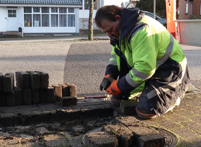 På et vinterkoldt fortov i Nordborg er Jeanette Skovmand i gang med at reetablere et fortov. Som brolægger foregår det meste af arbejdsdagen på knæ, men hun mærker ikke det kolde underlag gennem sine FENTO 200 Pro-knæbeskyttere. Pro-serien fra FENTO er udstyret med en 100% vandtæt overflade, der holder Jeanettes knæ tørre og varme – også i det kolde og våde danske vejr.